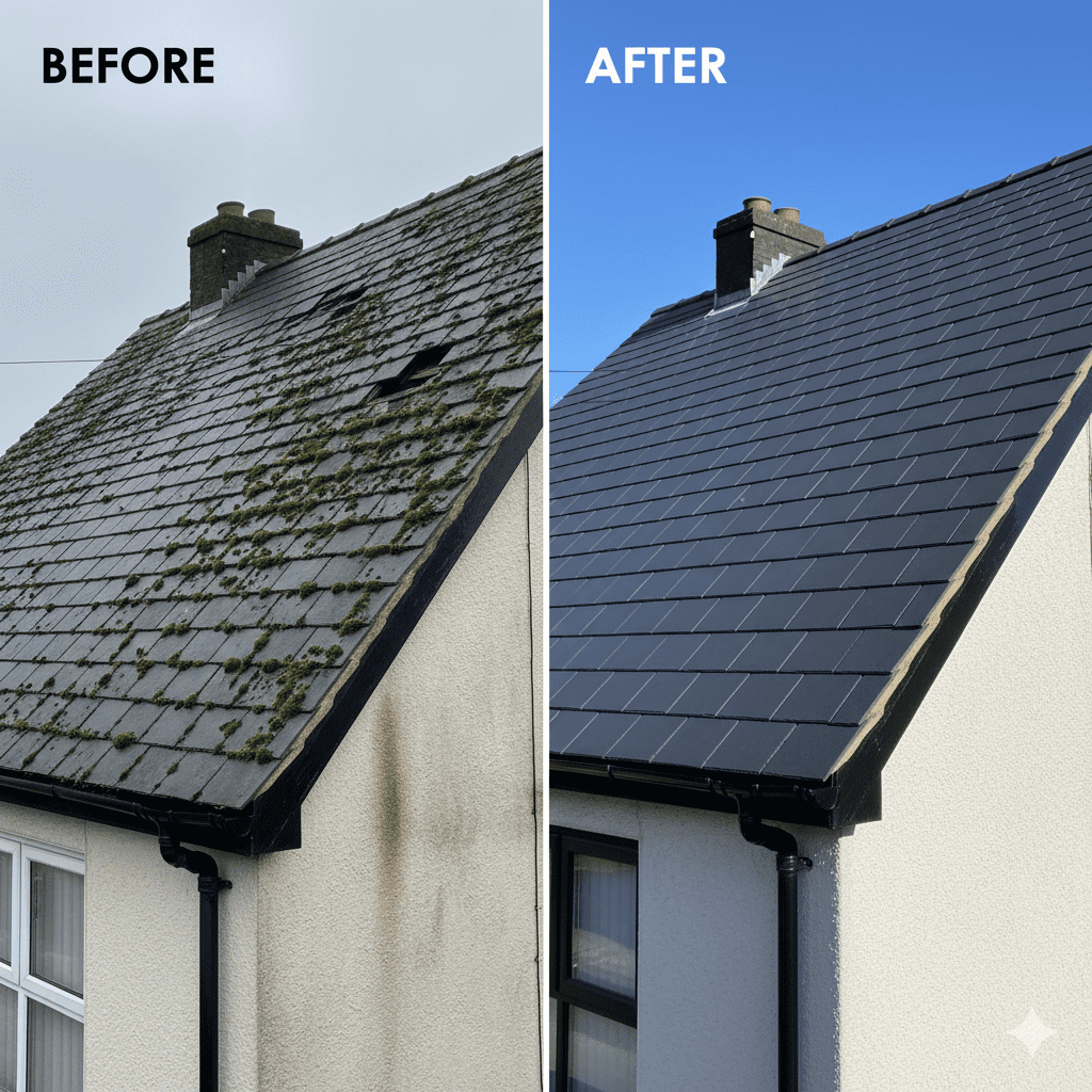• Moss Removal & Cleaning: Professional clearing of moss and debris that can trap moisture and cause tiles to crack or gutters to overflow.